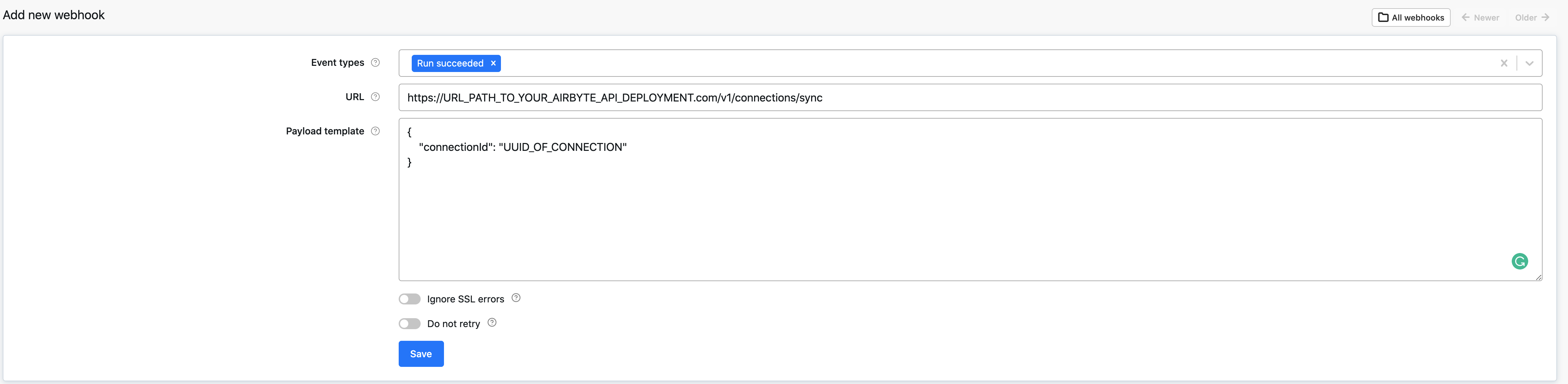 When your Apify job (aka Actor run) finishes, it can trigger an Airbyte sync by calling the Airbyte API manual connection trigger (POST /v1/connections/sync). The API can be called from Apify webhook which is executed when your Apify run finishes.